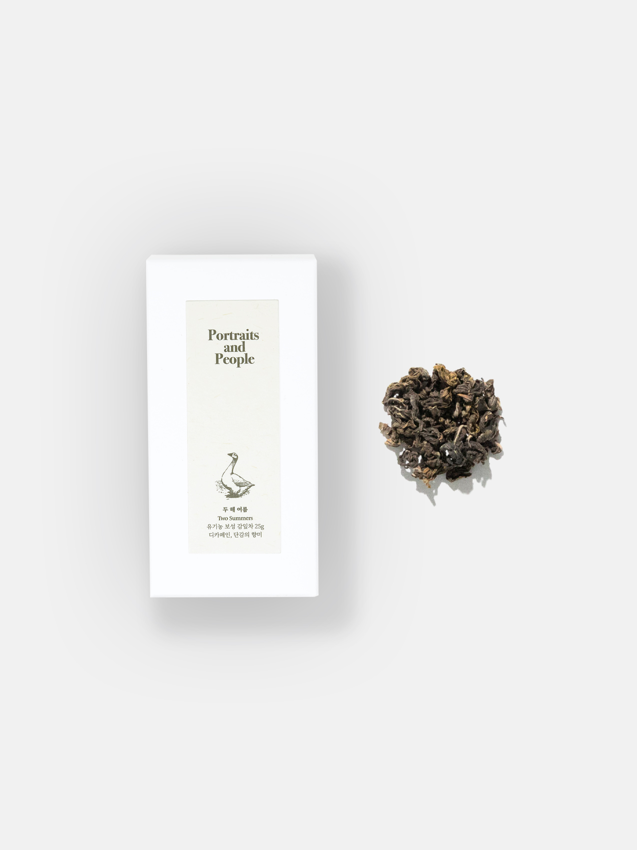 두 해 여름은 초여름 감나무 잎으로 만든 유기농 보성 감잎차입니다. 이 시기의 여린 감잎에는 비타 민과 칼슘이 가장 많이 들어 있어, 몸에 이롭고 체력을 유지하는 데 도움이 됩니다. 특히 비타민C가 풍부해 환절기에 마시기 좋습니다. 정갈하게 제다한 찻잎은 장인이 정성스레 선별한 것으로 그 자체 로 공예적 아름다움을 지니고, 활짝 펼쳐진 모습은 감잎 본연의 아름다움을 보여줍니다.