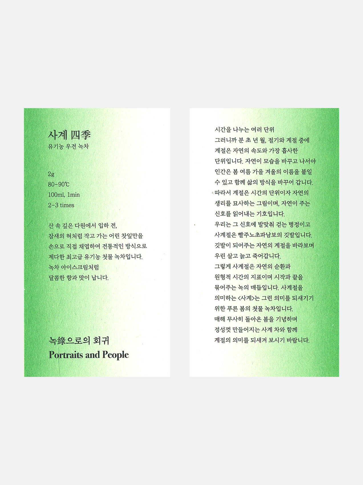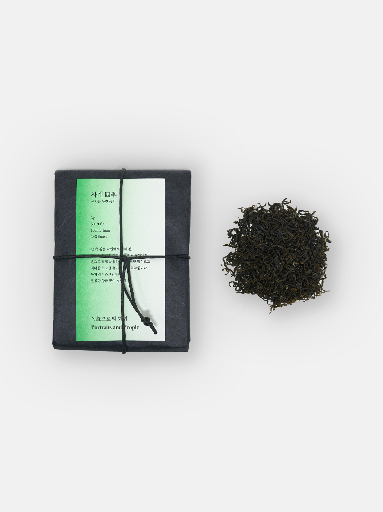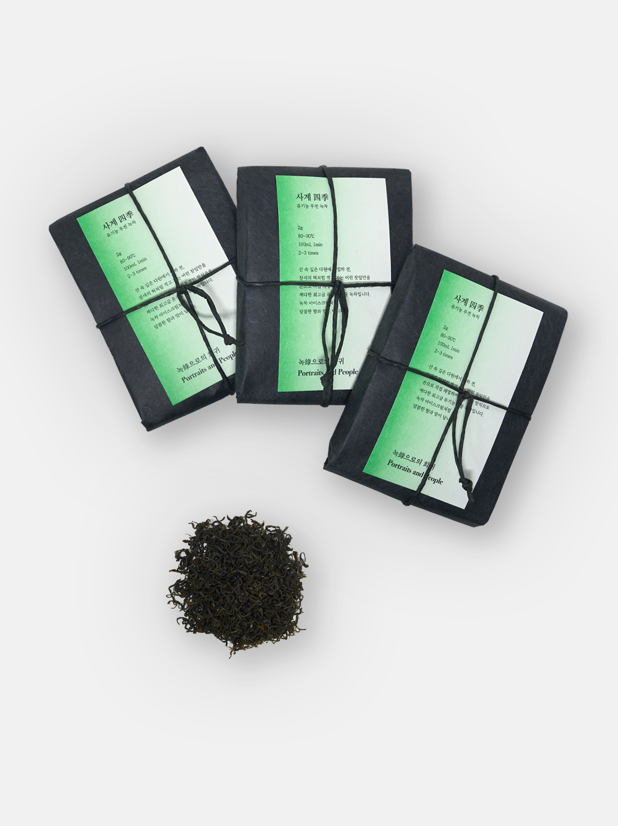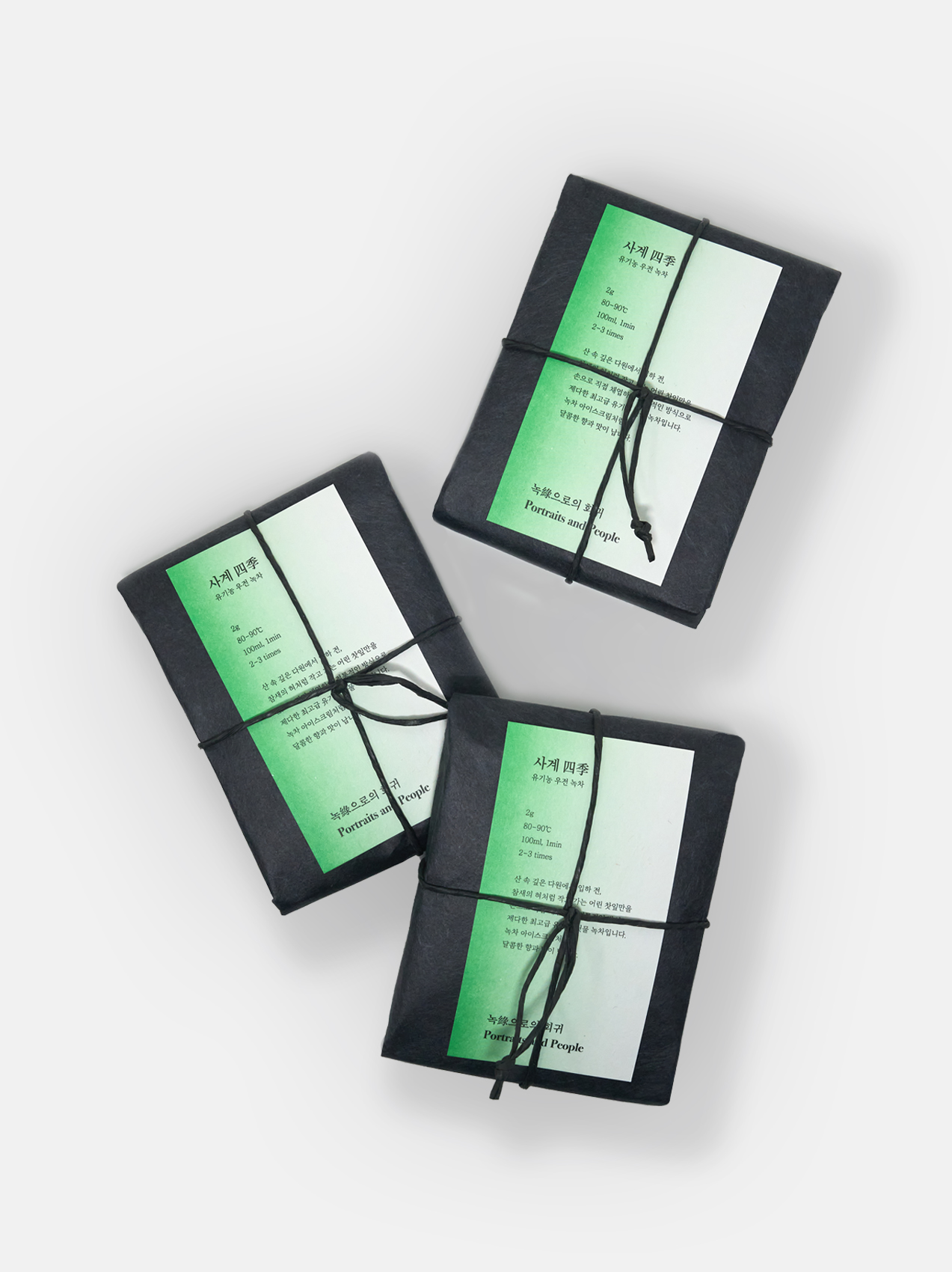 녹색의 차, 자연으로의 회귀라는 테마로 개발된 포트레이트앤드피플의 ‘녹綠으로의 회귀’ 시리즈는 한국의 전통적인 첩약 포장 방식을 오마주 하여 전통과 현대를 넘나드는 모습으로 특별하게 패키징된 유기농 한국차 컬렉션입니다. 자연주의적 메시지를 담은 티 내러티브 카드가 포함되어 있습니다.
